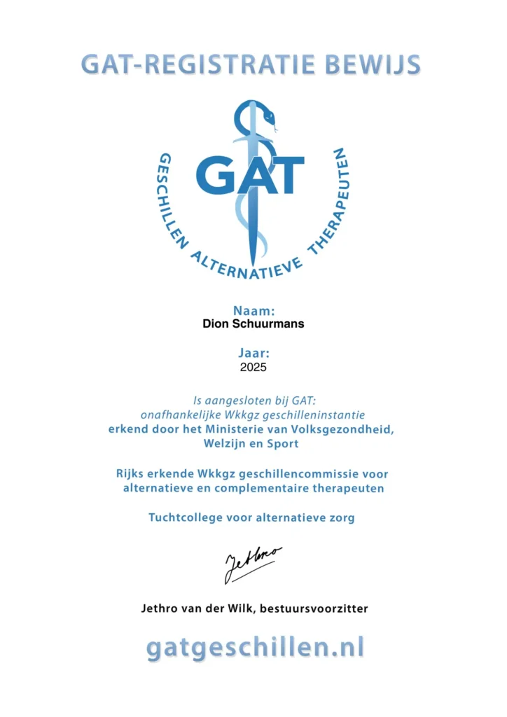 Als CAT-therapeut val ik onder de onafhankelijke geschillencommissie van het GAT.